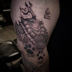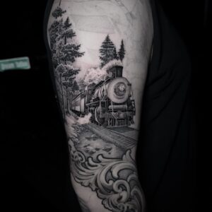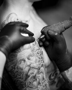 I enjoy doing all styles, but I have most experience with realism in both color or black and grey including portraits and lettering. I’ve been tattooing for over 12+ years. Over the years I’ve realized that my favorite thing to tattoo is statues/greek mythology and roses.
